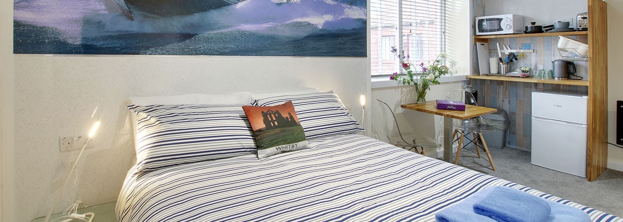 Silver Street Suites 13 is a cosy and contemporary mini suite room. These rooms are a studio style apartments with small kitchenette, dining and seating areas. Situated centrally in our Silver Street Suites building.